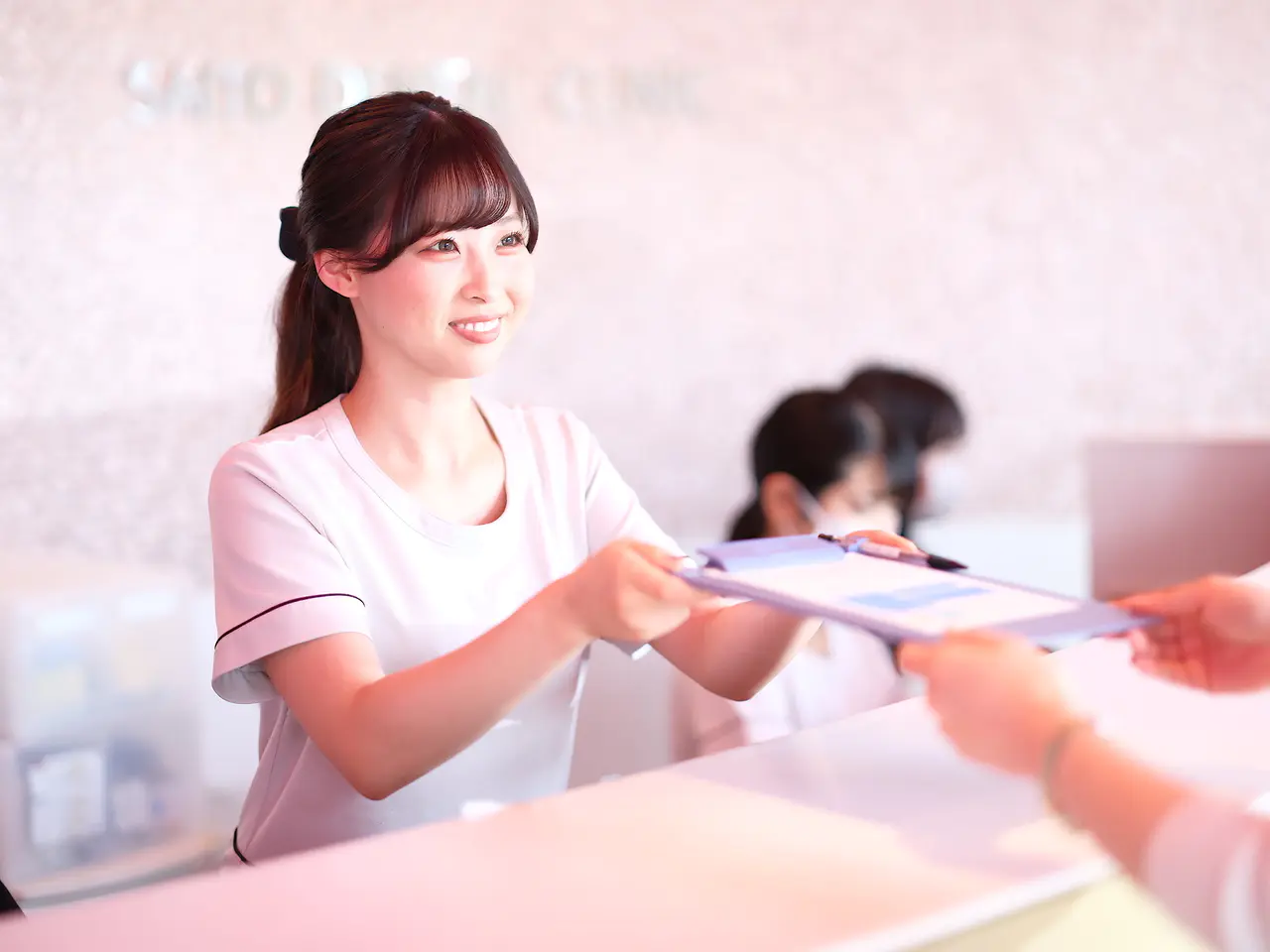 受付ではスタッフが笑顔でお迎えします。わからないことがありましたら、何でもお気軽にお声がけください。